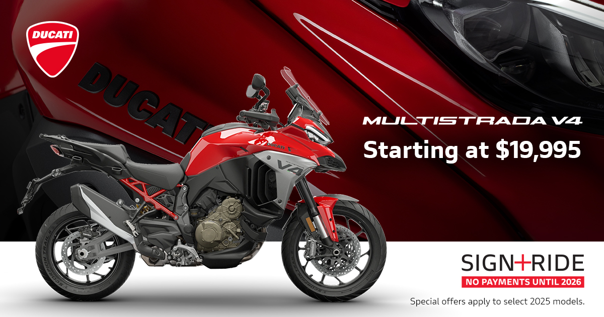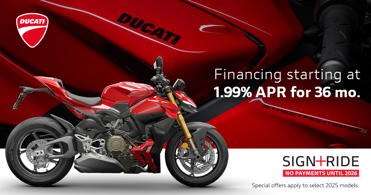 Offer available on select 2024 and 2025 models to highly qualified customers on approved credit by Ducati Financial Services through participating and authorized Ducati dealers from October 1 - 31, 2025. Down payment requirement varies from 0%-25% of the purchase price based on credit worthiness. Not all customers will qualify for the advertised APR. Minimum amount financed is $5,000. See your local Ducati dealer for financing details or, for general product information, call 1-888-391-5446. VW Credit, Inc. dba Ducati Financial Services is a servicer for VCI Loan Services, LLC. © 2025 Ducati North America.