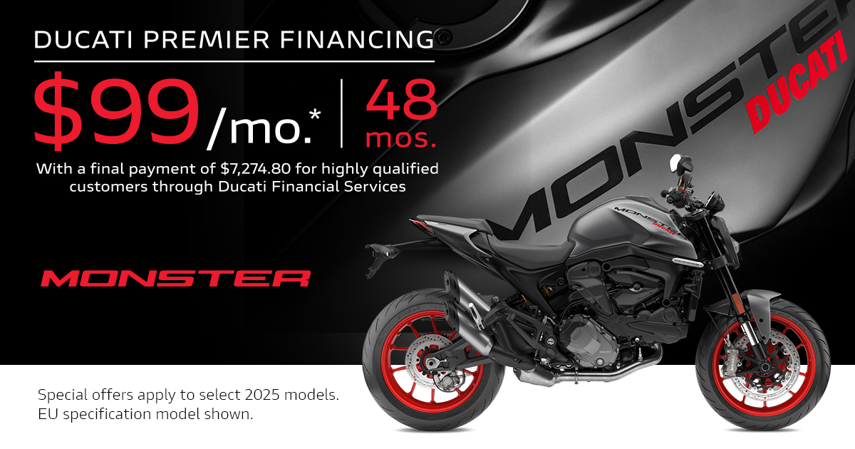 Offer available on select 2025 models to highly qualified customers on approved credit by Ducati Financial Services through participating and authorized Ducati dealers from December 2 - 30, 2025. Payments calculated with a $995 freight & setup. Payments shown exclude tax, title, license, options and dealer fees. Final terms and pricing are subject to negotiation between you and your dealer. APR stated not available in AL, IA, IL, KY, MI, OH, OK, SC & VA. Minimum amount financed of $10,000 to be eligible in MD & HI. Selling price must exceed $10,000 to be eligible in NJ and $7,500 to be eligible in NC. Ducati Premier Financing not available in NH, & PA. See your local Ducati dealer for financing details or, for general product information, call 1-888-391-5446. VW Credit, Inc. dba Ducati Financial Services is a servicer for VCI Loan Services, LLC. © 2025 Ducati North America.