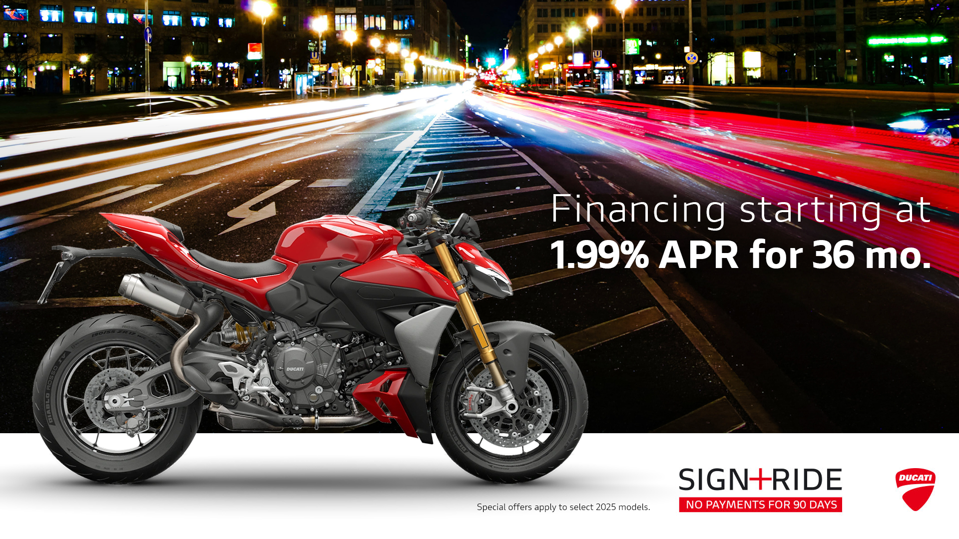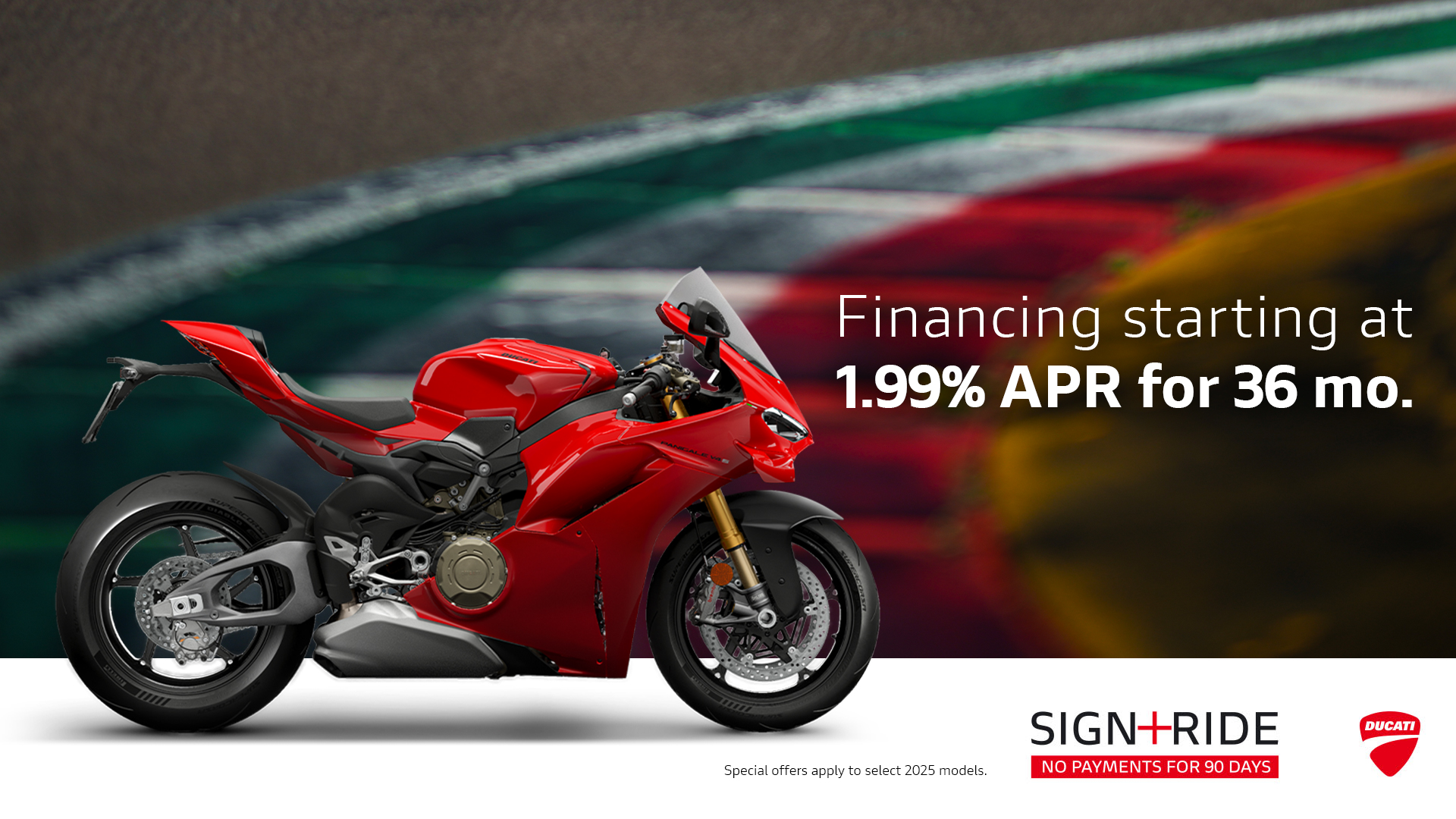 Offer available on select 2025 models to highly qualified customers on approved credit by Ducati Financial Services through participating and authorized Ducati dealers from January 6 - 31, 2026. Down payment requirement varies from 0%-25% of the purchase price based on credit worthiness. Not all customers will qualify for the advertised APR. Minimum amount financed is $5,000. See your local Ducati dealer for financing details or, for general product information, call 1-888-391-5446. VW Credit, Inc. dba Ducati Financial Services is a servicer for VCI Loan Services, LLC. © 2025 Ducati North America.